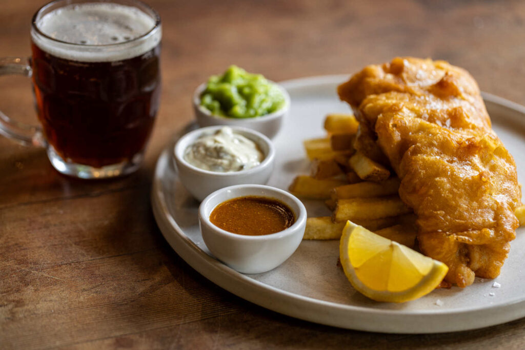 Beer-battered fish & chips, minted mushy peas, homemade tartare, curry sauce | 19.5 1657 kcals