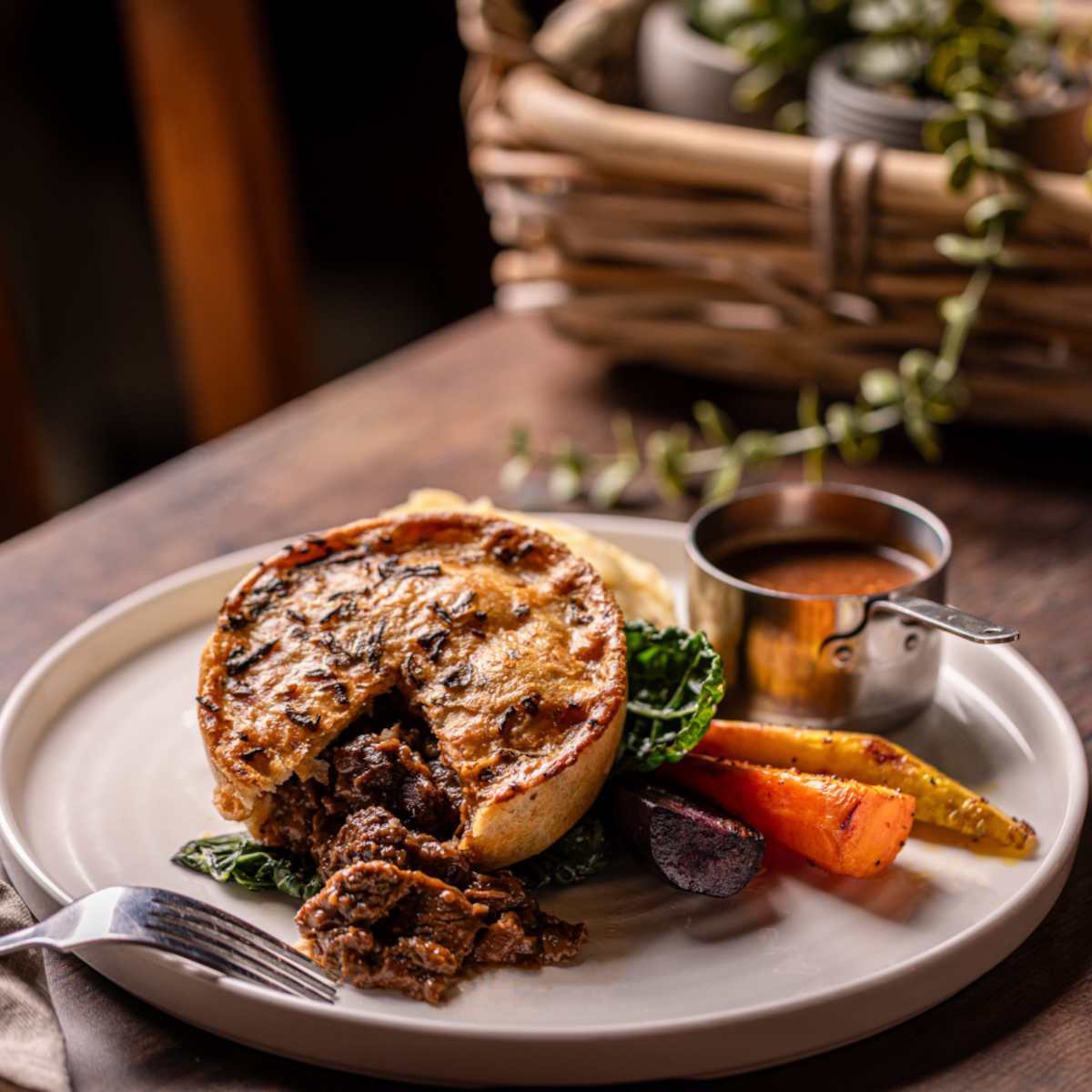 British, organic steak & ale pie, mash, roasted roots, buttered cavolo nero | 18.5 1107 kcals